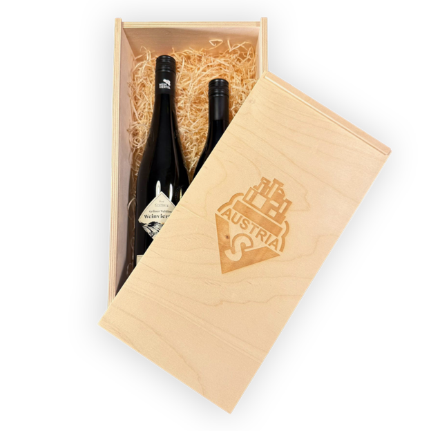 Die Austria Salzburg Holzweinkiste bietet Platz für drei ausgewählte Weine und eignet sich ideal als stilvolles Geschenk.